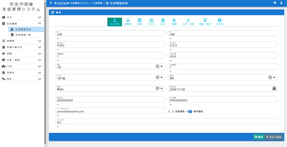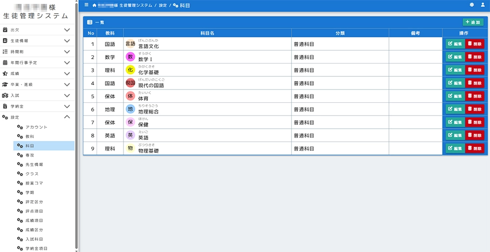 入学後の生徒情報、出欠、時間割、成績、証明書発行。
